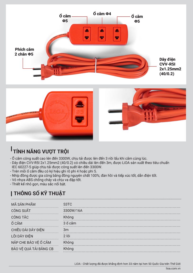 Ổ cắm chịu tải lioa. Biết được nhu cầu sử dụng ổ cắm công suất lớn của khách hàng. LIOA cho ra đời thêm Model S3TC ổ cắm công suất cao tiện cho nhu cầu sinh hoạt. Cắm được 2 nồi lẩu & 3 nồi lẩu liền 1 ổ cắm. công suất của ổ cắm điện lioa không quá 16A.