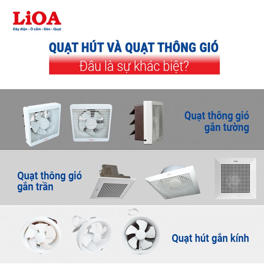 Cả QUẠT THÔNG GIÓ LIOA và QUẠT HÚT LIOA đều có tác dụng tạo ra không khí trong lành, sạch sẽ nhất có thể trong không gian mà chúng được lắp đặt. Sự khác biệt chính giữa hai loại quạt là ứng dụng của chúng. QUẠT THÔNG GIÓ LIOA khi hoạt động giúp đưa không khí sạch vào không gian kín từ nguồn bên ngoài, thì QUẠT HÚT LIOA có tác dụng loại bỏ các chất ô nhiễm từ không khí trong nhà trong gia đình hoặc không gian thương mại.