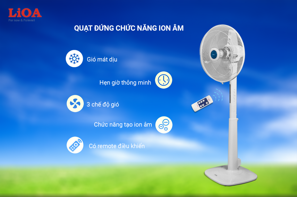 Theo các nghiên cứu khoa học thì ion âm có tác dụng lọc và khử mùi khó chịu, loại bỏ bớt các hạt bụi siêu nhỏ và các chất rắn lơ lửng trong không khí. Sự hiện diện các ion âm trong không khí được ghi nhận là giúp cải thiện sức khỏe tâm lý, năng suất và sức khỏe tổng thể cho con người, giúp giảm các triệu chứng dị ứng với bụi, bào tử nấm mốc và các chất gây dị ứng khác. Hiểu được các lợi ích này, LiOA đã ứng dụng công nghệ ion âm để cho ra dòng sản phẩm Quạt Đứng Chức Năng Ion Âm hiện đại.