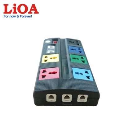 Ổ cắm kéo dài đa năng trung tâm có mạch chống sét đường thông tin 6 ổ LiOA : chịu được điện áp cao, bảo vệ quá tải bằng CB cùng 6 ổ cắm đa năng, phù hợp với mọi loại phích cắm có trên thị trường, giúp bạn cung cấp điện cho nhiều thiết bị cùng lúc. Các ổ cắm có các màu khác nhau giúp tránh nhầm lẫn, chỉ dẫn cụ thể, rõ ràng. Trang bị 2 mạch chống xung (chống sét) cho 2 đường thông tin độc lập (điện thoại và internet).