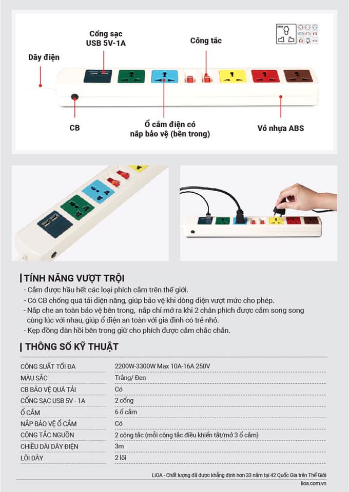 LiOA mang đến nhiều dòng ổ cắm với thiết kế từ 2 lỗ đến 12 lỗ, tích hợp cả cổng USB và các tính năng chống giật, chống quá tải. Điều này giúp người dùng dễ dàng chọn lựa sản phẩm phù hợp với nhu cầu sử dụng.