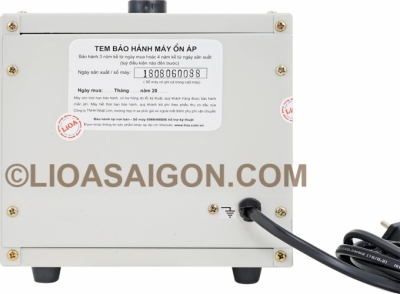 Phía sau ổn áp được LiOA gắn sãn một dây phích cắm dài 1m dùng dễ dàng chỉ việc cắm vào mạng điện và sử dụng ngay. Bên cạnh đó còn có tem hiển thị thông tin bảo hành và ngày sản xuất ổn áp LiOA