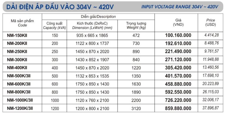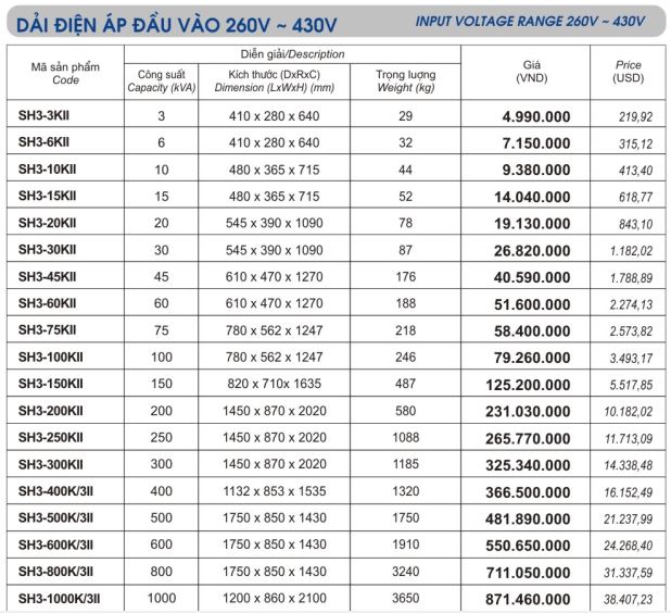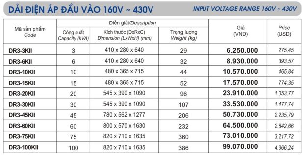 Trong bảng giá ổn áp LiOA có một số phần như sau: