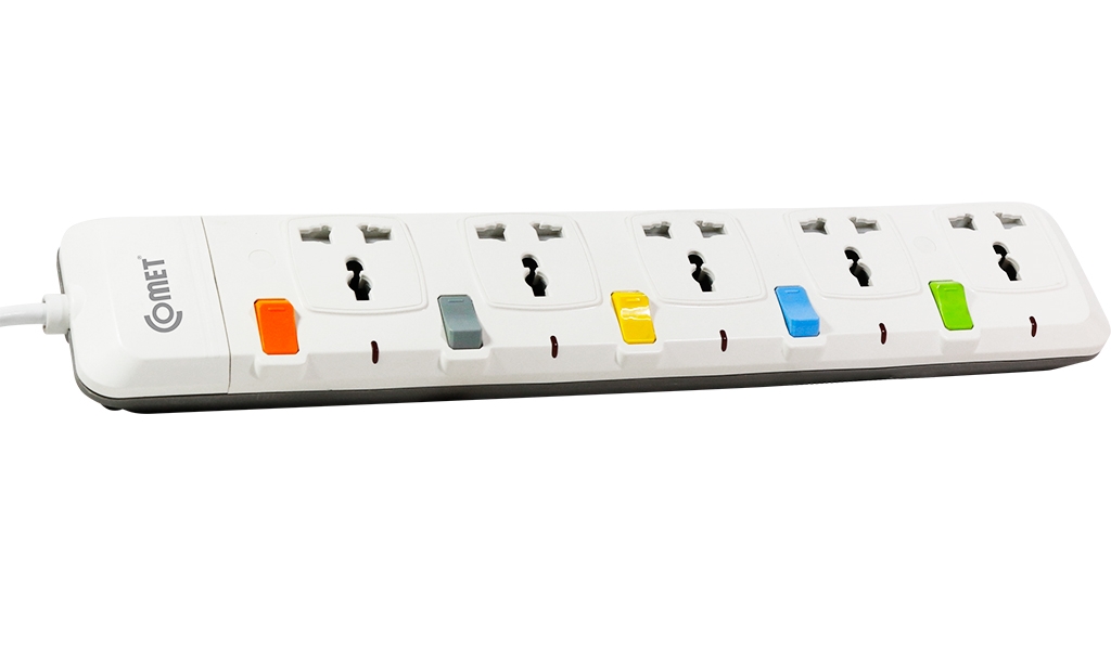 - Ổ cắm điện nối dài Comet CESG2503: đa năng cho tất cả các thiết bị điện 2 chấu hoặc 3 chấu, công suất 2500w, điện áp 250v, có 5 lỗ cắm điện an toàn và các công tắc ngắt kết nối riêng biệt.